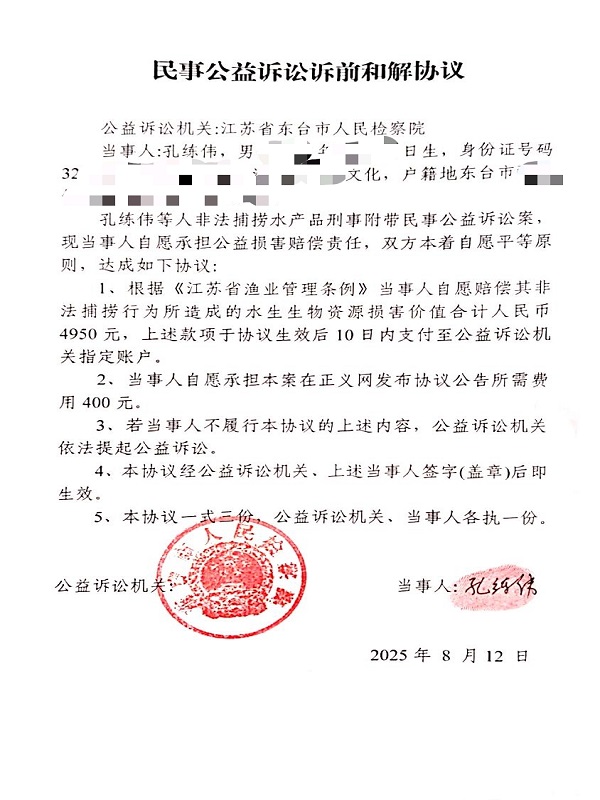 1、根据《江苏省渔业管理条例》当事人自愿赔偿其非法捕捞行为所造成的水生生物资源损害价值合计人民币4950元,上述款项于协议生效后10日内支付至公益诉讼机关指定账户。