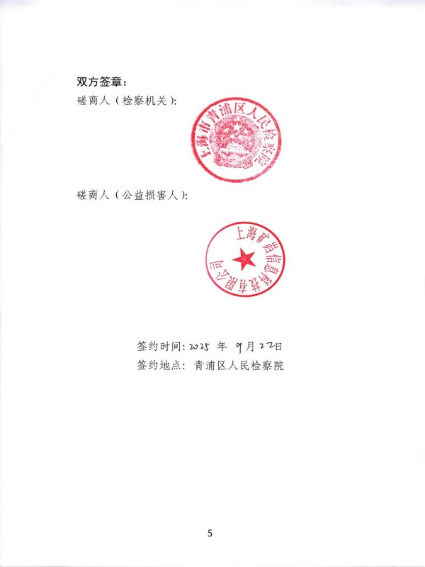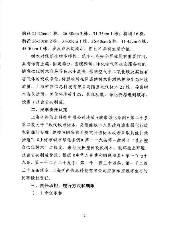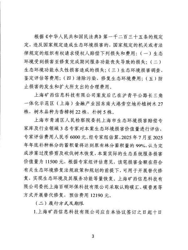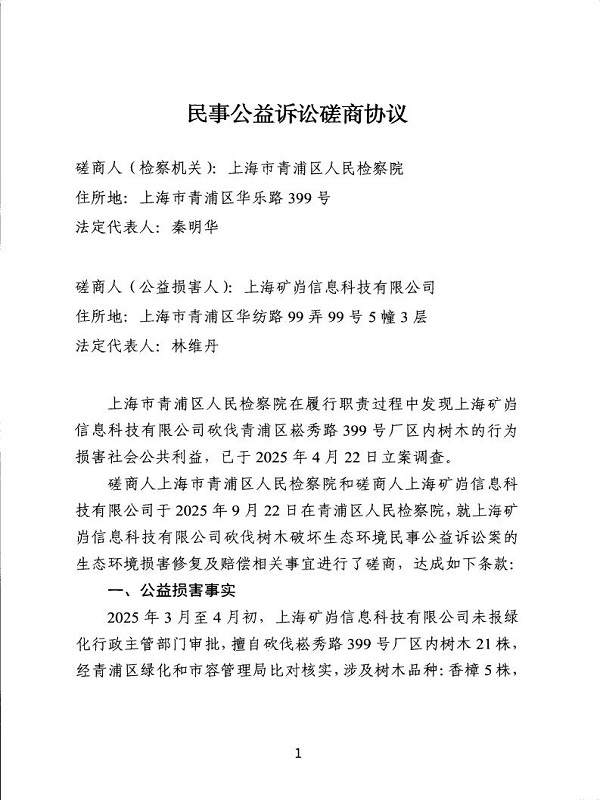 磋商人上海市青浦区人民检察院和磋商人上海矿岿信息科技有限公司于2025年9月22日在青浦区人民检察院,就上海矿岿信息科技有限公司砍伐树木破坏生态环境民事公益诉讼案的生态环境损害修复及赔偿相关事宜进行了磋商,达成如下条款: