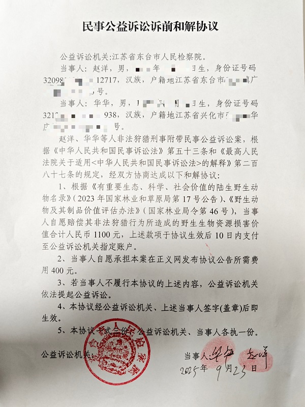赵洋、华华等人非法狩猎刑事附带民事公益诉讼案,根据《中华人民共和国民事诉讼法》第五十三条和《最高人民法院关于适用<中华人民共和国民事诉讼法>的解释》第二百八十七条的规定,经双方协商达成以下和解协议: