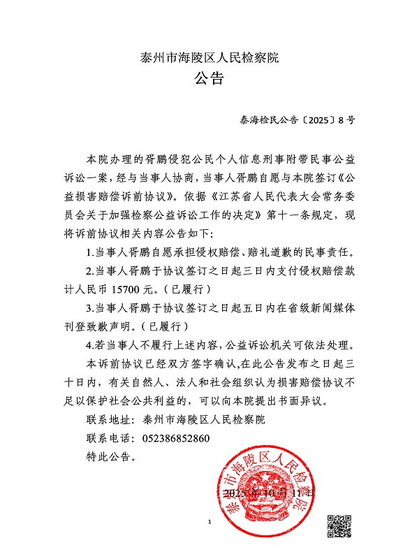 本院办理的胥鹏侵犯公民个人信息刑事附带民事公益诉讼一案,经与当事人协商,当事人胥鹏自愿与本院签订《公益损害赔偿诉前协议》。依据《江苏省人民代表大会常务委员会关于加强检察公益诉讼工作的决定》第十一条规定,现将诉前协议相关内容公告如下:
