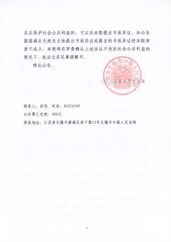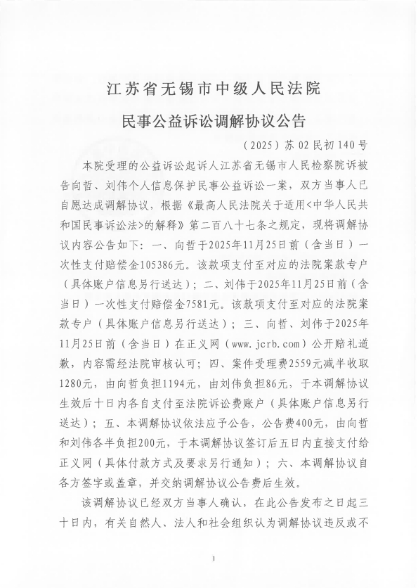江苏省无锡市中级人民法院关于向哲、刘伟个人信息保护民事公益诉讼一案和解协议的公告