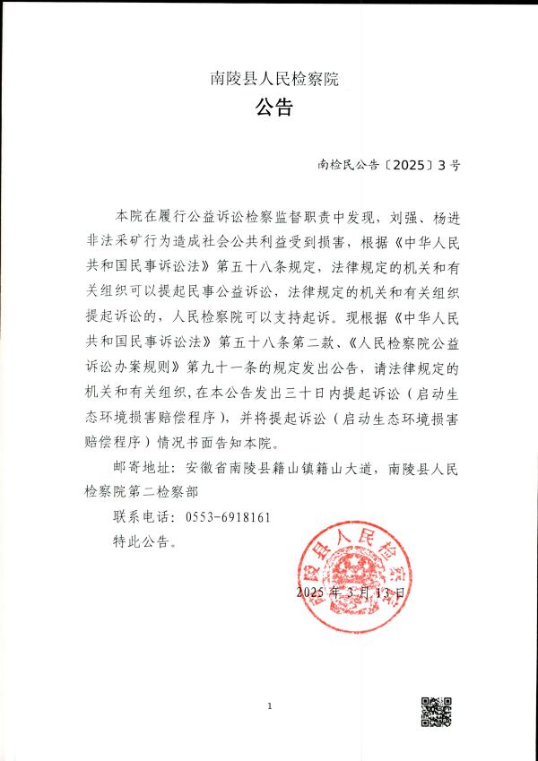 本院在履行公益诉讼检察监督职责中发现,刘强、杨进非法采矿行为造成社会公共利益受到损害,根据《中华人民共和国民事诉讼法》第五十八条规定,法律规定的机关和有关组织可以提起民事公益诉讼,法律规定的机关和有关组织提起诉讼的,人民检察院可以支持起诉。现根据《中华人民共和国民事诉讼法》第五十八条第二款、《人民检察院公益诉讼办案规则》第九十一条的规定发出公告,请法律规定的机关和有关组织,在本公告发出三十日内提起诉讼(启动生态环境损害赔偿程序),并将提起诉讼(启动生态环境损害赔偿程序)情况书面告知本院。