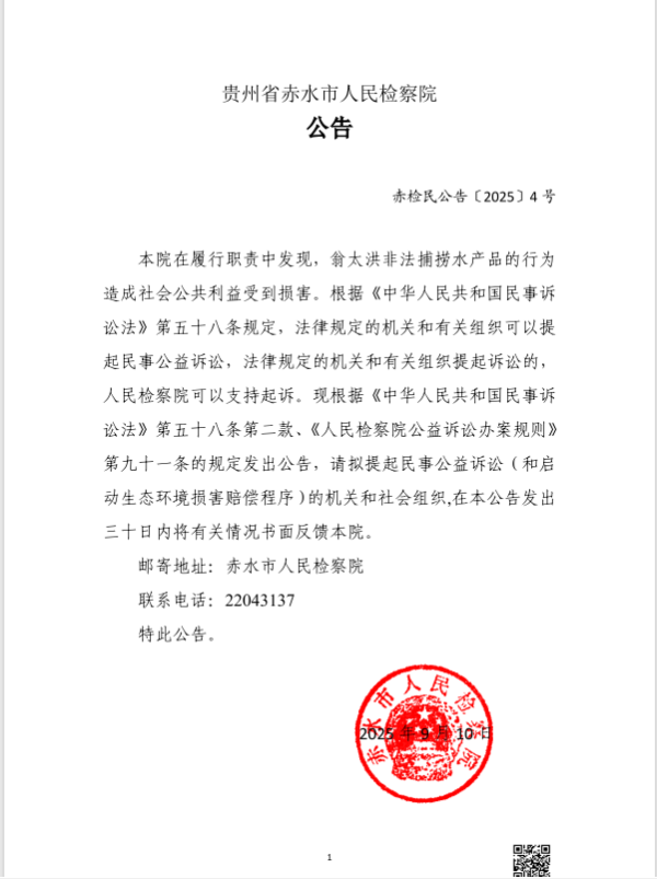 本院在履行职责中发现,翁太洪非法捕捞水产品的行为造成社会公共利益受到损害。根据《中华人民共和国民事诉讼法》第五十八条规定,法律规定的机关和有关组织可以提起民事公益诉讼,法律规定的机关和有关组织提起诉讼的,人民检察院可以支持起诉。现根据《中华人民共和国民事诉讼法》第五十八条第二款、《人民检察院公益诉讼办案规则》第九十一条的规定发出公告,请拟提起民事公益诉讼(和启动生态环境损害赔偿程序)的机关和社会组织,在本公告发出三十日内将有关情况书面反馈本院。
