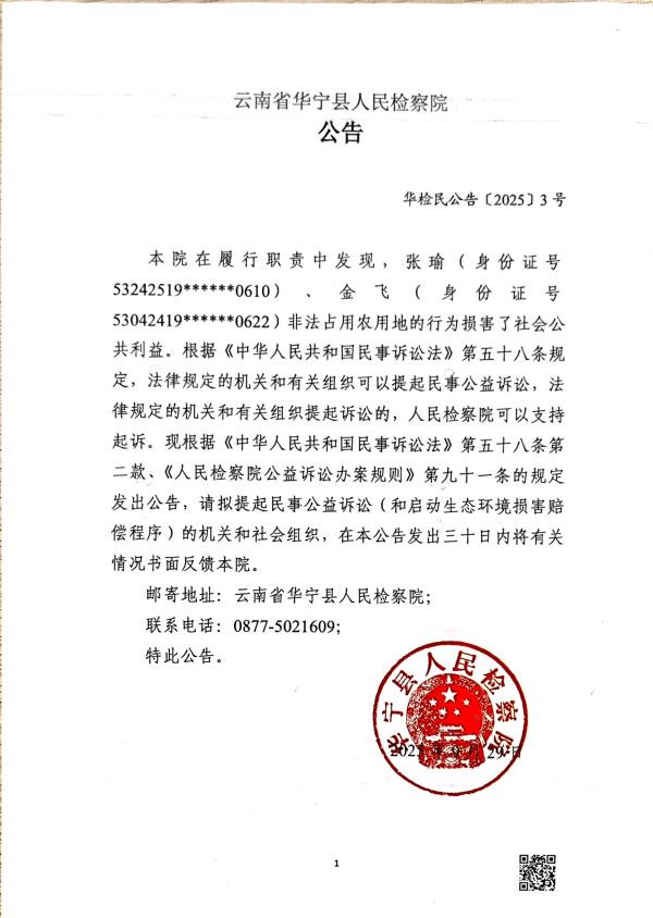 本院在履行职责中发现,张瑜(身份证号53242519******0610)、金飞(身份证号53042419******0622)非法占用农用地的行为损害了社会公共利益。根据《中华人民共和国民事诉讼法》第五十八条规定,法律规定的机关和有关组织可以提起民事公益诉讼,法律规定的机关和有关组织提起诉讼的,人民检察院可以支持起诉。现根据《中华人民共和国民事诉讼法》第五十八条第二款、《人民检察院公益诉讼办案规则》第九十一条的规定发出公告,请拟提起民事公益诉讼(和启动生态环境损害赔偿程序)的机关和社会组织,在本公告发出三十日内将有关情况书面反馈本院。
