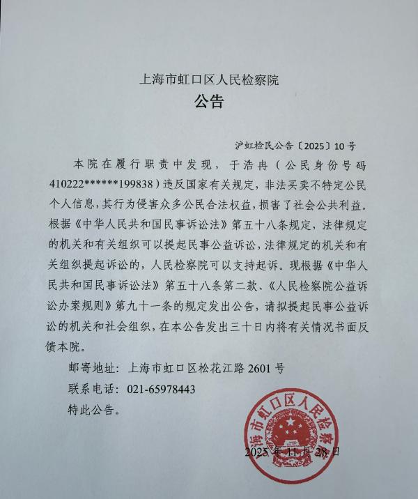 本院在履行职责中发现,于浩冉(公民身份号码410222******199838)违反国家有关规定,非法买卖不特定公民个人信息,其行为侵害众多公民合法权益,损害了社会公共利益。根据《中华人民共和国民事诉讼法》第五十八条规定,法律规定的机关和有关组织可以提起民事公益诉讼,法律规定的机关和有关组织提起诉讼的,人民检察院可以支持起诉。现根据《中华人民共和国民事诉讼法》第五十八条第二款、《人民检察院公益诉讼办案规则》第九十一条的规定发出公告,请拟提起民事公益诉讼的机关和社会组织,在本公告发出三十日内将有关情况书面反馈本院。
