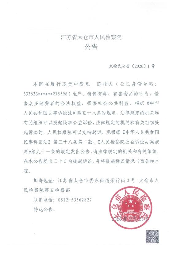 本院在履行职责中发现,陈桂夫(公民身份号码:332623******275596)生产、销售有毒、有害食品的行为,侵害众多消费者的合法权益,损害社会公共利益。根据《中华人民共和国民事诉讼法》第五十八条的规定,法律规定的机关和有关组织可以提起民事公益诉讼,法律规定的机关和有关组织提起诉讼的,人民检察院可以支持起诉。现根据《中华人民共和国民事诉讼法》第五十八条第二款、《人民检察院公益诉讼办案规则》第九十一条的规定发出公告,请法律规定的机关和有关组织,在本公告发出三十日内提起诉讼,并将提起诉讼情况书面告知本院。