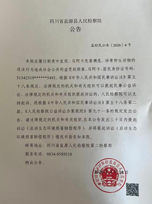 本院在履行职责中发现,马阿卡危害濒危、珍贵野生动物的违法行为造成社会公共利益受到损害。马阿卡,居民身份证号码:51342319******5493。根据《中华人民共和国民事诉讼法》第五十八条规定,法律规定的机关和有关组织可以提起民事公益诉讼,法律规定的机关和有关组织提起诉讼的,人民检察院可以支持起诉。现根据《中华人民共和国民事诉讼法》第五十八条第二款、《人民检察院公益诉讼办案规则》第九十一条的规定发出公告,请法律规定的机关和有关组织,在本公告发出三十日内提起诉讼(启动生态环境损害赔偿程序),并将提起诉讼(启动生态环境损害赔偿程序)情况书面告知本院。
