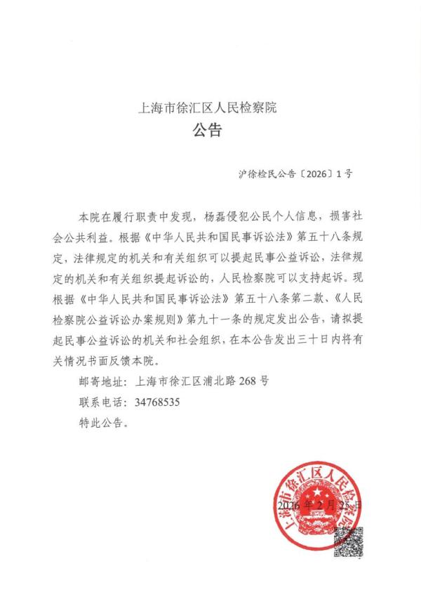 本院在履行职责中发现,杨磊侵犯公民个人信息,损害社会公共利益。根据《中华人民共和国民事诉讼法》第五十八条规定,法律规定的机关和有关组织可以提起民事公益诉讼,法律规定的机关和有关组织提起诉讼的,人民检察院可以支持起诉。现根据《中华人民共和国民事诉讼法》第五十八条第二款、《人民检察院公益诉讼办案规则》第九十一条的规定发出公告,请拟提起民事公益诉讼的机关和社会组织,在本公告发出三十日内将有关情况书面反馈本院。