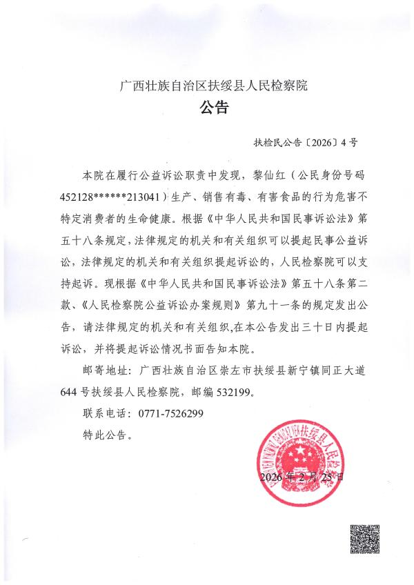 本院在履行公益诉讼职责中发现,黎仙红(公民身份号码452128******213041)生产、销售有毒、有害食品的行为危害不特定消费者的生命健康。根据《中华人民共和国民事诉讼法》第五十八条规定,法律规定的机关和有关组织可以提起民事公益诉讼,法律规定的机关和有关组织提起诉讼的,人民检察院可以支持起诉。现根据《中华人民共和国民事诉讼法》第五十八条第二款、《人民检察院公益诉讼办案规则》第九十一条的规定发出公告,请法律规定的机关和有关组织,在本公告发出三十日内提起诉讼,并将提起诉讼情况书面告知本院。
