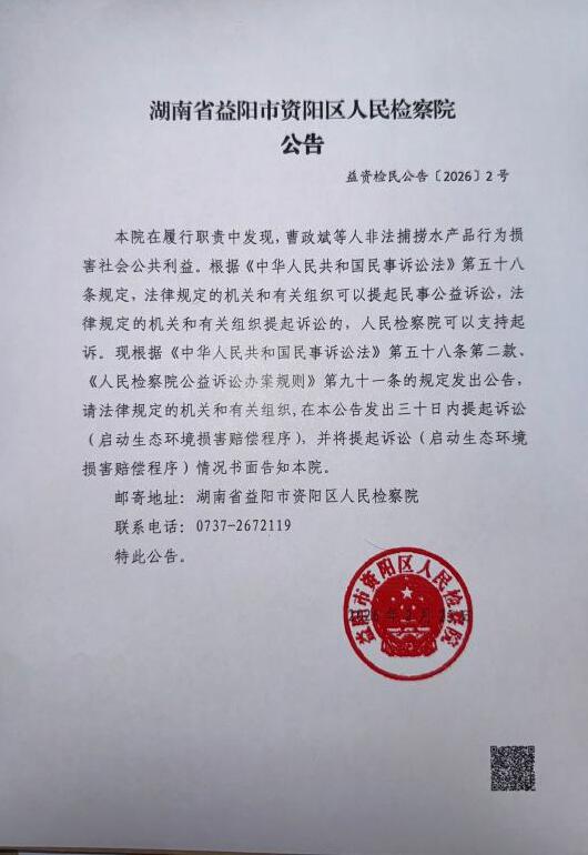 本院在履行职责中发现,曹政斌等人非法捕捞水产品行为损害社会公共利益。根据《中华人民共和国民事诉讼法》第五十八条规定,法律规定的机关和有关组织可以提起民事公益诉讼,法律规定的机关和有关组织提起诉讼的,人民检察院可以支持起诉。现根据《中华人民共和国民事诉讼法》第五十八条第二款,《人民检察院公益诉讼办案规则》第九十一条的规定发出公告,请法律规定的机关和有关组织,在本公告发出三十日内提起诉讼(启动生态环境损害赔偿程序),并将提起诉讼(启动生态环境损害赔偿程序)情况书面告知本院。