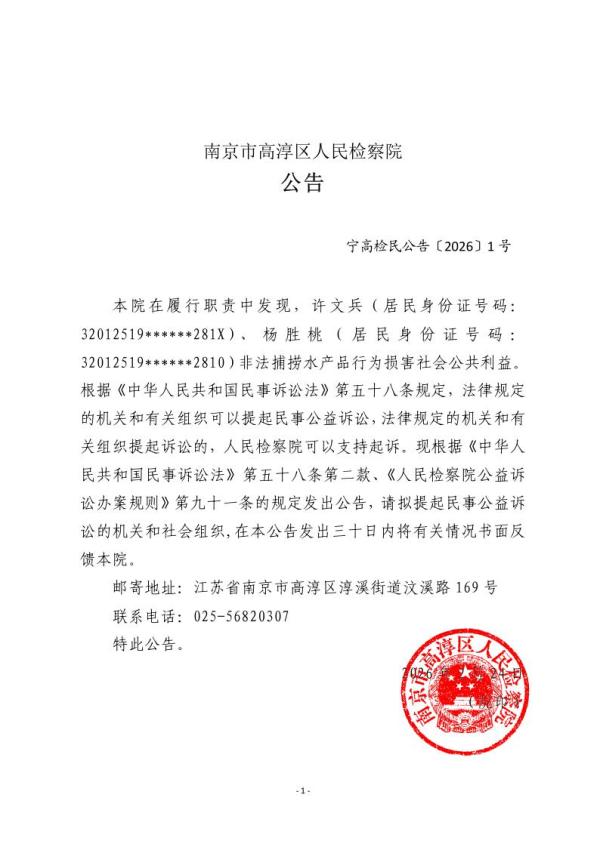 本院在履行职责中发现,许文兵(居民身份证号码:32012519******281X)、杨胜桃(居民身份证号码:32012519******2810)非法捕捞水产品行为损害社会公共利益。根据《中华人民共和国民事诉讼法》第五十八条规定,法律规定的机关和有关组织可以提起民事公益诉讼,法律规定的机关和有关组织提起诉讼的,人民检察院可以支持起诉。现根据《中华人民共和国民事诉讼法》第五十八条第二款、《人民检察院公益诉讼办案规则》第九十一条的规定发出公告,请拟提起民事公益诉讼的机关和社会组织,在本公告发出三十日内将有关情况书面反馈本院。