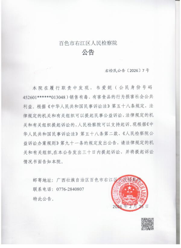 本院在履行职责中发现,韦爱妮(公民身份号码452601******013048)销售有毒、有害食品的行为损害社会公共利益。根据《中华人民共和国民事诉讼法》第五十八条规定,法律规定的机关和有关组织可以提起民事公益诉讼,法律规定的机关和有关组织提起诉讼的,人民检察院可以支持起诉。现根据《中华人民共和国民事诉讼法》第五十八条第二款、《人民检察院公益诉讼办案规则》第九十一条的规定发出公告,请法律规定的机关和有关组织,在本公告发出三十日内提起诉讼,并将提起诉讼情况书面告知本院。