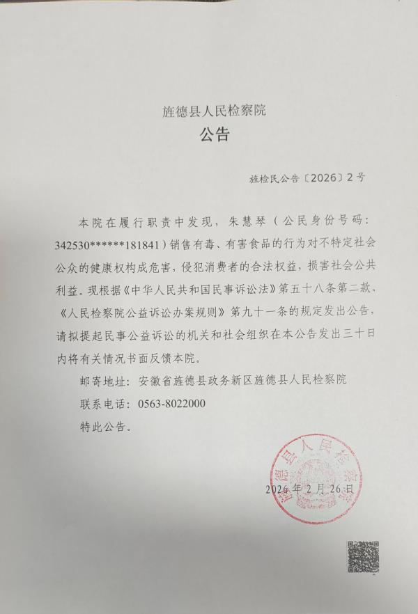 本院在履行职责中发现,朱慧琴(公民身份号码:342530******181841)销售有毒、有害食品的行为对不特定社会公众的健康权构成危害,侵犯消费者的合法权益,损害社会公共利益。现根据《中华人民共和国民事诉讼法》第五十八条第二款、《人民检察院公益诉讼办案规则》第九十一条的规定发出公告,请拟提起民事公益诉讼的机关和社会组织在本公告发出三十日内将有关情况书面反馈本院。