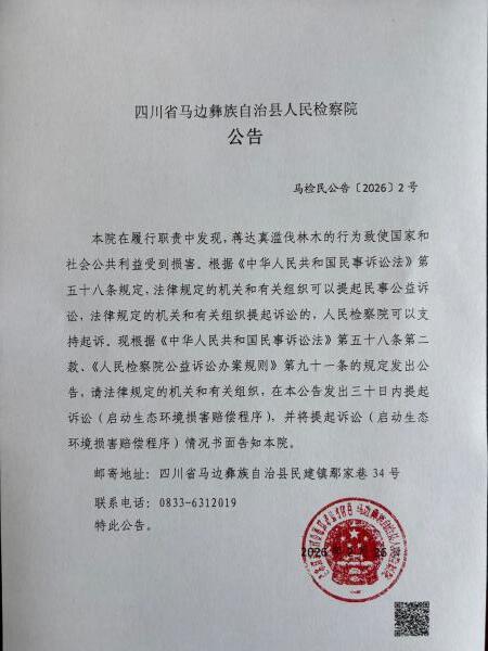 本院在履行职责中发现,蒋达真滥伐林木的行为致使国家和社会公共利益受到损害。根据《中华人民共和国民事诉讼法》第五十八条规定,法律规定的机关和有关组织可以提起民事公益诉讼,法律规定的机关和有关组织提起诉讼的,人民检察院可以支持起诉。现根据《中华人民共和国民事诉讼法》第五十八条第二款、《人民检察院公益诉讼办案规则》第九十一条的规定发出公告,请法律规定的机关和有关组织,在本公告发出三十日内提起诉讼(启动生态环境损害赔偿程序),并将提起诉讼(启动生态环境损害赔偿程序)情况书面告知本院。