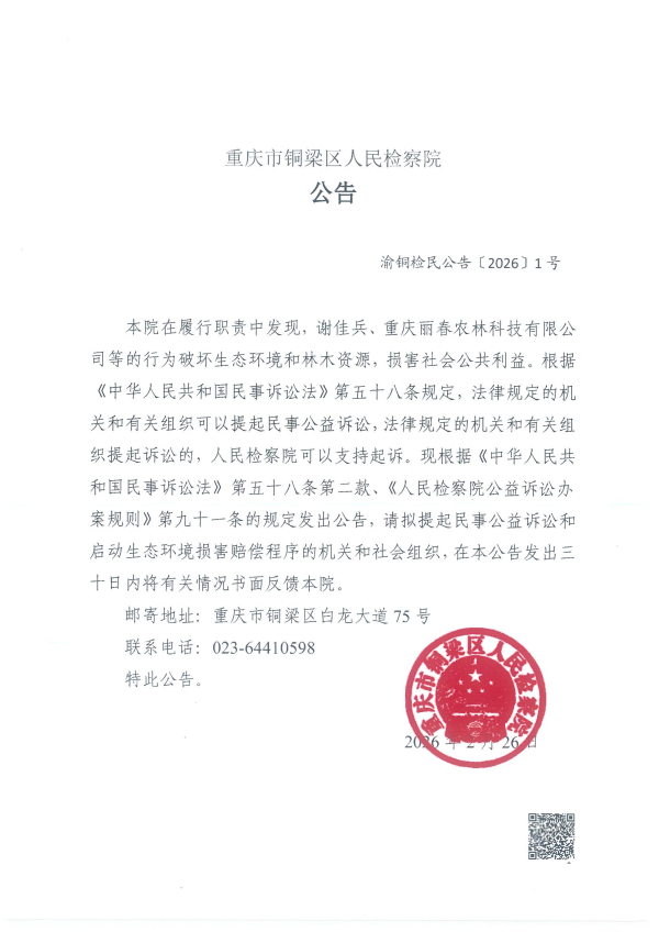 本院在履行职责中发现,谢佳兵、重庆丽春农林科技有限公司等的行为破坏生态环境和林木资源,损害社会公共利益。根据《中华人民共和国民事诉讼法》第五十八条规定,法律规定的机关和有关组织可以提起民事公益诉讼,法律规定的机关和有关组织提起诉讼的,人民检察院可以支持起诉。现根据《中华人民共和国民事诉讼法》第五十八条第二款、《人民检察院公益诉讼办案规则》第九十一条的规定发出公告,请拟提起民事公益诉讼和启动生态环境损害赔偿程序的机关和社会组织,在本公告发出三十日内将有关情况书面反馈本院。