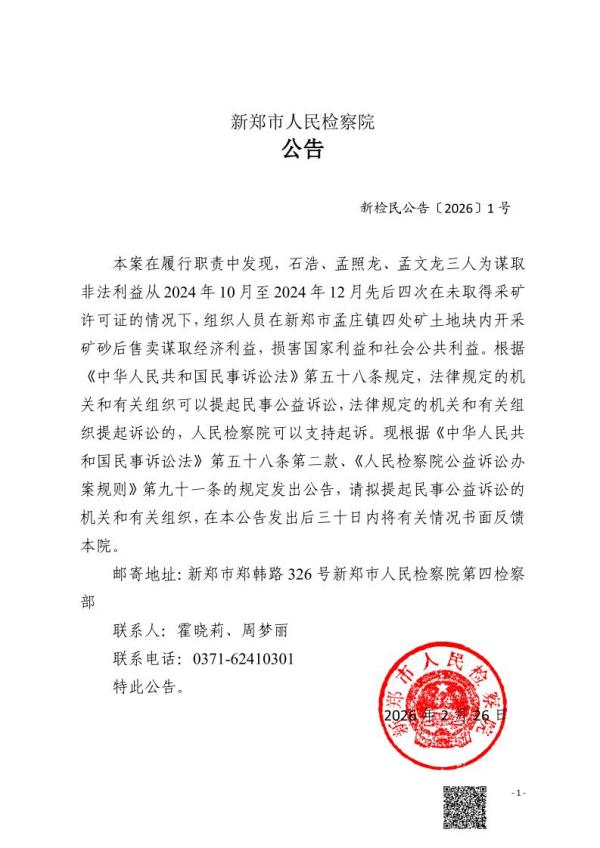 本案在履行职责中发现,石浩、孟照龙、孟文龙三人为谋取非法利益从2024年10月至2024年12月先后四次在未取得采矿许可证的情况下,组织人员在新郑市孟庄镇四处矿土地块内开采矿砂后售卖谋取经济利益,损害国家利益和社会公共利益。根据《中华人民共和国民事诉讼法》第五十八条规定,法律规定的机关和有关组织可以提起民事公益诉讼,法律规定的机关和有关组织提起诉讼的,人民检察院可以支持起诉。现根据《中华人民共和国民事诉讼法》第五十八条第二款、《人民检察院公益诉讼办案规则》第九十一条的规定发出公告,请拟提起民事公益诉讼的机关和有关组织,在本公告发出后三十日内将有关情况书面反馈本院。