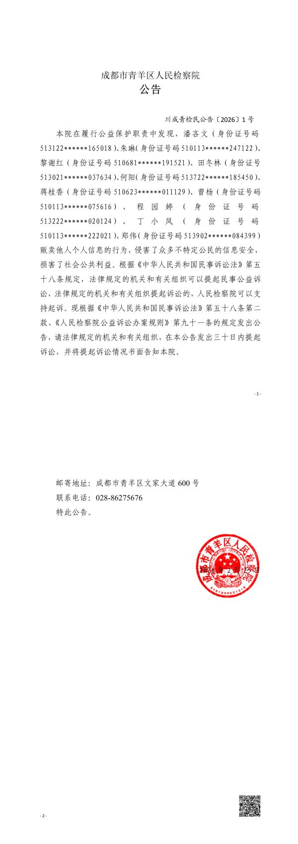本院在履行公益保护职责中发现,潘吝文(身份证号码513122******165018)、朱琳(身份证号码510113******247122)、黎谢红(身份证号码510681******191521)、田冬林(身份证号码513021******037634)、何阳(身份证号码513722******185450)、蒋桂香(身份证号码510623******011129)、曾杨(身份证号码510113******075616)、程园婷(身份证号码513222******020124)、丁小凤(身份证号码510113******222021)、郑伟(身份证号码513902******084399)贩卖他人个人信息的行为,侵害了众多不特定公民的信息安全,损害了社会公共利益。根据《中华人民共和国民事诉讼法》第五十八条规定,法律规定的机关和有关组织可以提起民事公益诉讼,法律规定的机关和有关组织提起诉讼的,人民检察院可以支持起诉。现根据《中华人民共和国民事诉讼法》第五十八条第二款、《人民检察院公益诉讼办案规则》第九十一条的规定发出公告,请法律规定的机关和有关组织,在本公告发出三十日内提起诉讼,并将提起诉讼情况书面告知本院。