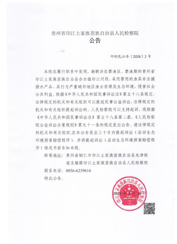 本院在履行职责中发现,谢朝洪在禁渔区、禁渔期的贵州省印江土家族苗族自治县合水镇印江河段,采用禁用的渔具非法捕捞水产品,其行为严重破坏地区渔业资源及生态环境,侵害社会公共利益。根据《中华人民共和国民事诉讼法》第五十八条规定,法律规定的机关和有关组织可以提起民事公益诉讼,法律规定的机关和有关组织提起诉讼的,人民检察院可以支持起诉。现根据《中华人民共和国民事诉讼法》第五十八条第二款、《人民检察院公益诉讼办案规则》第九十一条的规定发出公告,请法律规定的机关和有关组织,在本公告发出三十日内提起诉讼(启动生态环境损害赔偿程序),并将提起诉讼(启动生态环境损害赔偿程序)情况书面告知本院。