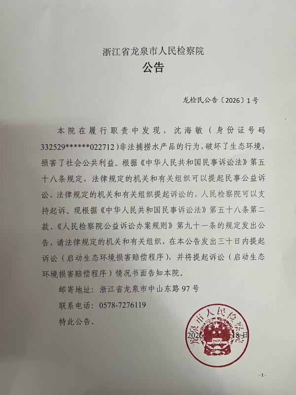 本院在履行职责中发现,沈海敏(身份证号码332529******022712)非法捕捞水产品的行为,破坏了生态环境,损害了社会公共利益。根据《中华人民共和国民事诉讼法》第五十八条规定,法律规定的机关和有关组织可以提起民事公益诉讼,法律规定的机关和有关组织提起诉讼的,人民检察院可以支持起诉。现根据《中华人民共和国民事诉讼法》第五十八条第二款、《人民检察院公益诉讼办案规则》第九十一条的规定发出公告,请法律规定的机关和有关组织,在本公告发出三十日内提起诉讼(启动生态环境损害赔偿程序),并将提起诉讼(启动生态环境损害赔偿程序)情况书面告知本院。
