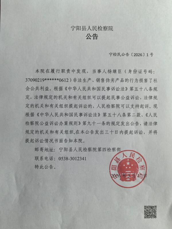 本院在履行职责中发现,当事人杨继臣(身份证号码:37090219******0612)非法生产、销售伪劣产品的行为损害了社会公共利益。根据《中华人民共和国民事诉讼法》第五十八条规定,法律规定的机关和有关组织可以提起民事公益诉讼,法律规定的机关和有关组织提起诉讼的,人民检察院可以支持起诉。现根据《中华人民共和国民事诉讼法》第五十八条第二款、《人民检察院公益诉讼办案规则》第九十一条的规定发出公告,请法律规定的机关和有关组织,在本公告发出三十日内提起诉讼,并将提起诉讼情况书面告知本院。