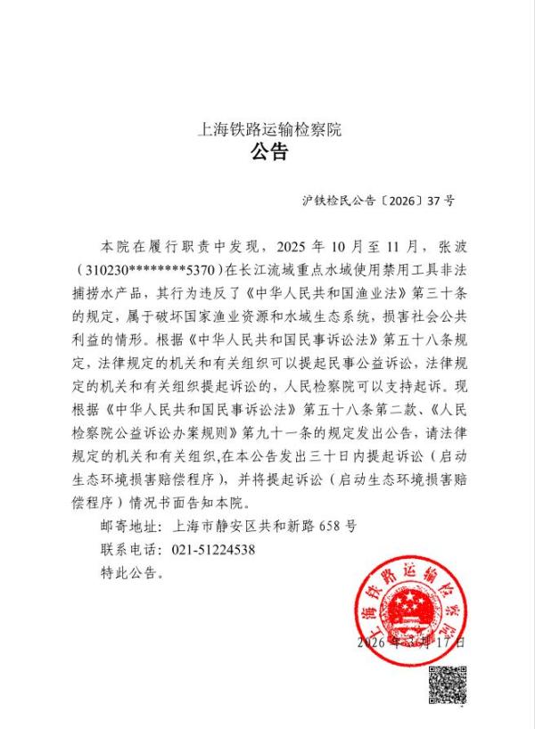 本院在履行职责中发现,2025年10月至11月,张波(310230********5370)在长江流域重点水域使用禁用工具非法捕捞水产品,其行为违反了《中华人民共和国渔业法》第三十条的规定,属于破坏国家渔业资源和水域生态系统,损害社会公共利益的情形。根据《中华人民共和国民事诉讼法》第五十八条规定,法律规定的机关和有关组织可以提起民事公益诉讼,法律规定的机关和有关组织提起诉讼的,人民检察院可以支持起诉。现根据《中华人民共和国民事诉讼法》第五十八条第二款、《人民检察院公益诉讼办案规则》第九十一条的规定发出公告,请法律规定的机关和有关组织,在本公告发出三十日内提起诉讼(启动生态环境损害赔偿程序),并将提起诉讼(启动生态环境损害赔偿程序)情况书面告知本院。