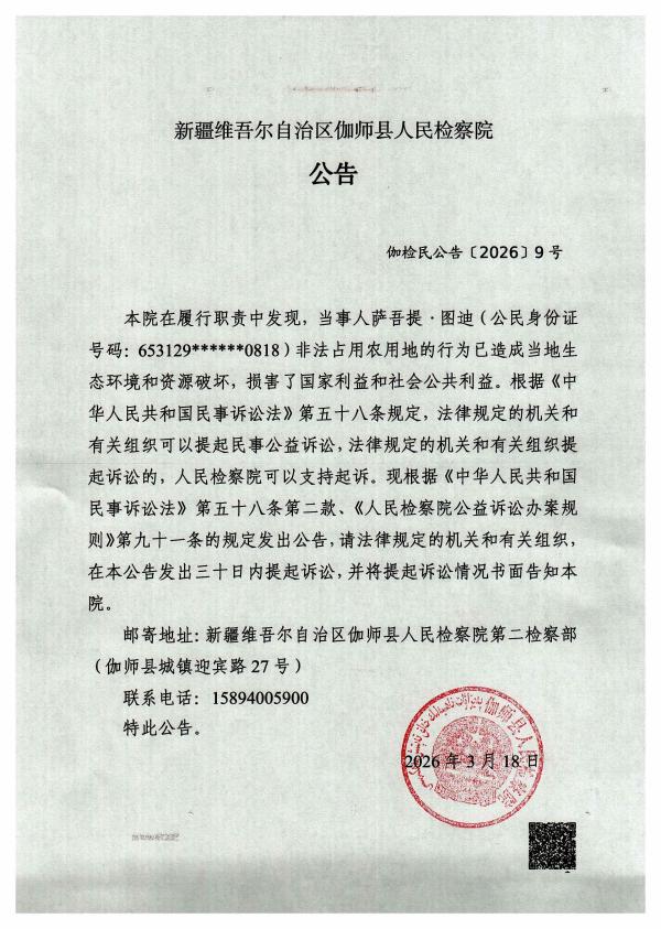 本院在履行职责中发现,当事人萨吾提·图迪(公民身份证号码:653129******0818)非法占用农用地的行为已造成当地生态环境和资源破坏,损害了国家利益和社会公共利益。根据《中华人民共和国民事诉讼法》第五十八条规定,法律规定的机关和有关组织可以提起民事公益诉讼,法律规定的机关和有关组织提起诉讼的,人民检察院可以支持起诉。现根据《中华人民共和国民事诉讼法》第五十八条第二款、《人民检察院公益诉讼办案规则》第九十一条的规定发出公告,请法律规定的机关和有关组织,在本公告发出三十日内提起诉讼,并将提起诉讼情况书面告知本院。
