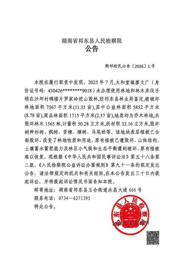 本院在履行职责中发现,2025年7月,太和堂镇廖文广(身份证号码:430426********9018)未办理使用林地和林木采伐手续在沙坪村碉楼片罗家岭挖山毁林,经祁东县林业局鉴定,被破坏林地面积7567平方米(11.35亩),其中公益林面积5852平方米(8.78亩),商品林面积1715平方米(2.57亩),地类均为乔木林地,共毁坏林木1565林,计蓄积50.28立方米,折材积32.16立方米,毁坏树种杉树、枫树、苦楝、樟树、马尾松等。该地块表层植被已全部毁坏,改变了林地性质和用途,原有植被已遭毁坏,山体结构、土壤蓄水蓄肥能力及林区小气候和生态平衡遭到破坏,原有植被难以恢复。现根据《中华人民共和国民事诉讼法》第五十八条第二款、《人民检察院公益诉讼办案规则》第九十一条的规定发出公告,请法律规定的机关和有关组织,在本公告发出三十日内提起诉讼,并将提起诉讼情况书面告知本院。