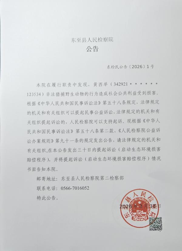 本院在履行职责中发现,黄西举(342921******123534)非法猎捕野生动物的行为造成社会公共利益受到损害。根据《中华人民共和国民事诉讼法》第五十八条规定,法律规定的机关和有关组织可以提起民事公益诉讼,法律规定的机关和有关组织提起诉讼的,人民检察院可以支持起诉。现根据《中华人民共和国民事诉讼法》第五十八条第二款、《人民检察院公益诉讼办案规则》第九十一条的规定发出公告,请法律规定的机关和有关组织,在本公告发出三十日内提起诉讼(启动生态环境损害赔偿程序),并将提起诉讼(启动生态环境损害赔偿程序)情况书面告知本院。