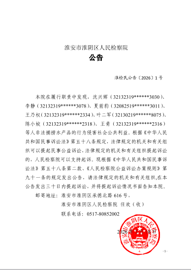 本院在履行职责中发现,沈兴辉(32132319******3030)、李静(32132319******3078)、夏前豹(32082519******3011)、王乃权(32132319******2334)、叶二军(32130219******8075)、陈小姣(32132319******2318)、王青(32132319******2316)等人非法捕捞水产品的行为侵害社会公共利益。根据《中华人民共和国民事诉讼法》第五十八条规定,法律规定的机关和有关组织可以提起民事公益诉讼,法律规定的机关和有关组织提起诉讼的,人民检察院可以支持起诉。现根据《中华人民共和国民事诉讼法》第五十八条第二款、《人民检察院公益诉讼办案规则》第九十一条的规定发出公告,请法律规定的机关和有关组织,在本公告发出三十日内提起诉讼,并将提起诉讼情况书面告知本院。