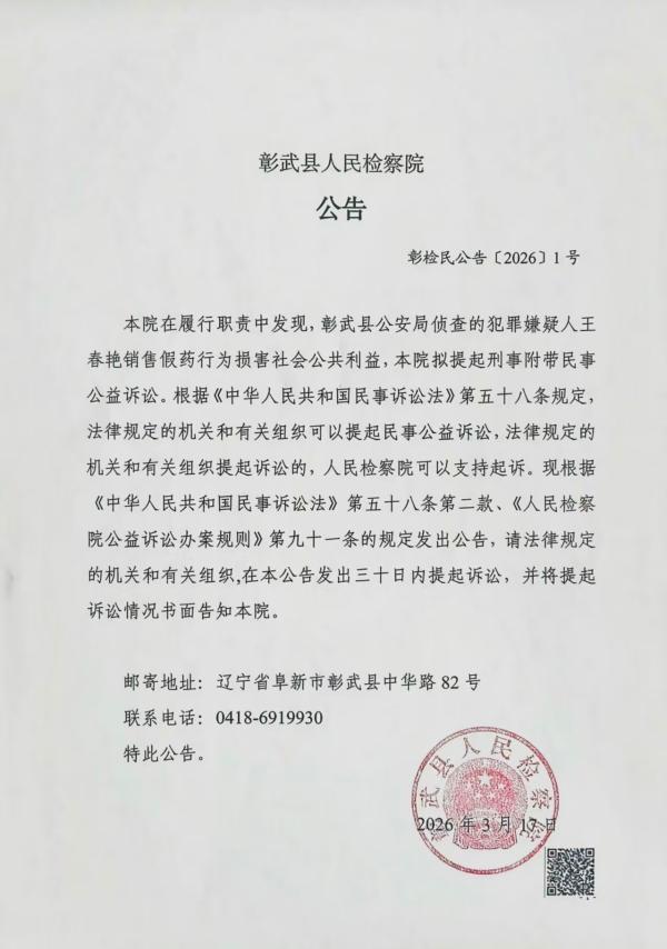本院在履行职责中发现,彰武县公安局侦查的犯罪嫌疑人王春艳销售假药行为损害社会公共利益,本院拟提起刑事附带民事公益诉讼。根据《中华人民共和国民事诉讼法》第五十八条规定,法律规定的机关和有关组织可以提起民事公益诉讼,法律规定的机关和有关组织提起诉讼的,人民检察院可以支持起诉。现根据《中华人民共和国民事诉讼法》第五十八条第二款、《人民检察院公益诉讼办案规则》第九十一条的规定发出公告,请法律规定的机关和有关组织,在本公告发出三十日内提起诉讼,并将提起诉讼情况书面告知本院。