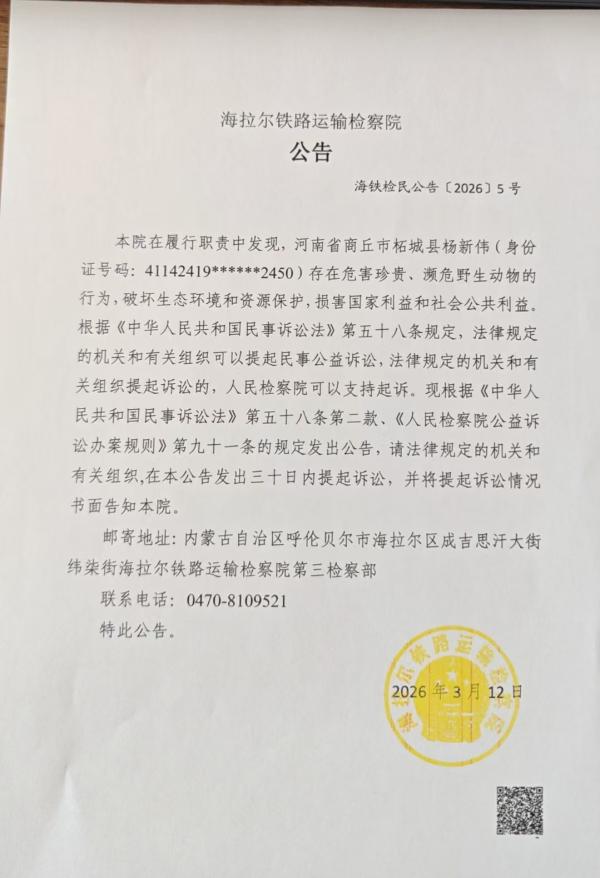 本院在履行职责中发现,河南省商丘市柘城市杨新伟(身份证号码:41142419******2450)存在危害珍贵、濒危野生动物的行为,破坏生态环境和资源保护,损害国家利益和社会公共利益。根据《中华人民共和国民事诉讼法》第五十八条规定,法律规定的机关和有关组织可以提起民事公益诉讼,法律规定的机关和有关组织提起诉讼的,人民检察院可以支持起诉。现根据《中华人民共和国民事诉讼法》第五十八条第二款、《人民检察院公益诉讼办案规则》第九十一条的规定发出公告,请法律规定的机关和有关组织,在本公告发出三十日内提起诉讼(启动生态环境损害赔偿程序),并将提起诉讼(启动生态环境损害赔偿程序)情况书面告知本院。