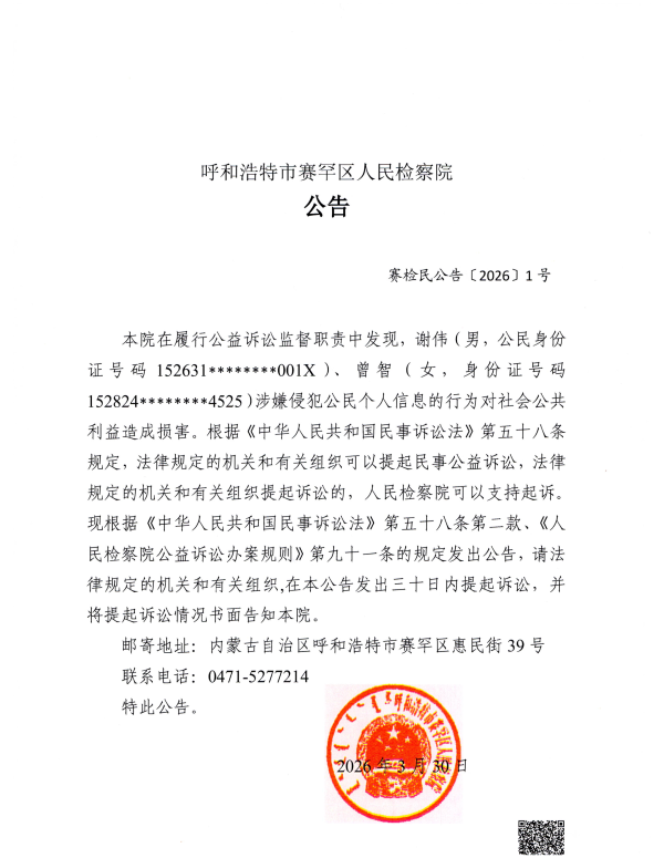 本院在履行公益诉讼监督职责中发现,谢伟(男,公民身份证号码152631********001X)、曾智(女,身份证号码152824********4525)涉嫌侵犯公民个人信息的行为对社会公共利益造成损害。根据《中华人民共和国民事诉讼法》第五十八条规定,法律规定的机关和有关组织可以提起民事公益诉讼,法律规定的机关和有关组织提起诉讼的,人民检察院可以支持起诉。现根据《中华人民共和国民事诉讼法》第五十八条第二款、《人民检察院公益诉讼办案规则》第九十一条的规定发出公告,请法律规定的机关和有关组织,在本公告发出三十日内提起诉讼,并将提起诉讼情况书面告知本院。