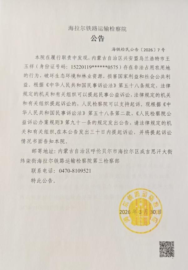 本院在履行职责中发现,内蒙古自治区兴安盟乌兰浩特市王玉祥(身份证号码:15220119******0575)存在非法占用农用地的行为,破坏生态环境和林业资源,损害国家利益和社会公共利益。根据《中华人民共和国民事诉讼法》第五十八条规定,法律规定的机关和有关组织可以提起民事公益诉讼,法律规定的机关和有关组织提起诉讼的,人民检察院可以支持起诉。现根据《中华人民共和国民事诉讼法》第五十八条第二款、《人民检察院公益诉讼办案规则》第九十一条的规定发出公告,请法律规定的机关和有关组织,在本公告发出三十日内提起诉讼(启动生态环境损害赔偿程序),并将提起诉讼(启动生态环境损害赔偿程序)情况书面告知本院。