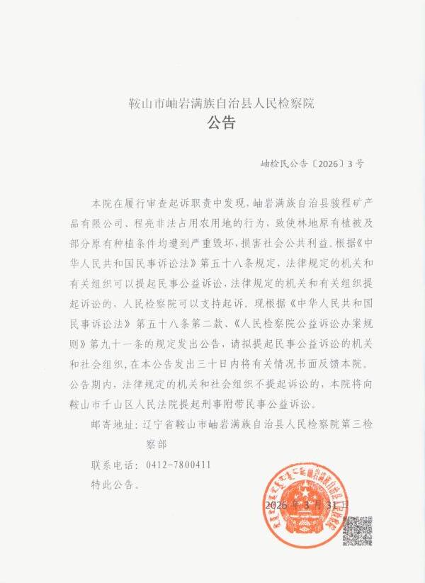 本院在履行审查起诉职责中发现,岫岩满族自治县骏程矿产品有限公司、程亮非法占用农用地的行为,致使林地原有植被及部分原有种植条件均遭到严重毁坏,损害社会公共利益。根据《中华人民共和国民事诉讼法》第五十八条规定,法律规定的机关和有关组织可以提起民事公益诉讼,法律规定的机关和有关组织提起诉讼的,人民检察院可以支持起诉。现根据《中华人民共和国民事诉讼法》第五十八条第二款、《人民检察院公益诉讼办案规则》第九十一条的规定发出公告,请拟提起民事公益诉讼的机关和社会组织,在本公告发出三十日内将有关情况书面反馈本院。公告期内,法律规定的机关和社会组织不提起诉讼的,本院将向鞍山市千山区人民法院提起刑事附带民事公益诉讼。