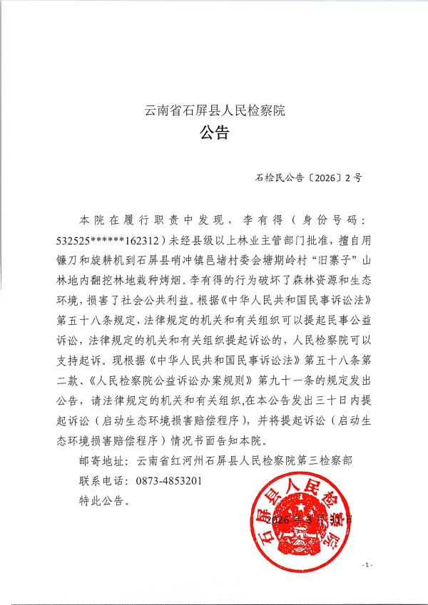 本院在履行职责中发现,李有得(身份号码:532525******162312)未经县级以上林业主管部门批准,擅自用镰刀和旋耕机到石屏县哨冲镇邑堵村委会塘期岭村“旧寨子”山林地内翻挖林地栽种烤烟。李有得的行为破坏了森林资源和生态环境,损害了社会公共利益。根据《中华人民共和国民事诉讼法》第五十八条规定,法律规定的机关和有关组织可以提起民事公益诉讼,法律规定的机关和有关组织提起诉讼的,人民检察院可以支持起诉。现根据《中华人民共和国民事诉讼法》第五十八条第二款、《人民检察院公益诉讼办案规则》第九十一条的规定发出公告,请法律规定的机关和有关组织,在本公告发出三十日内提起诉讼(启动生态环境损害赔偿程序),并将提起诉讼(启动生态环境损害赔偿程序)情况书面告知本院。