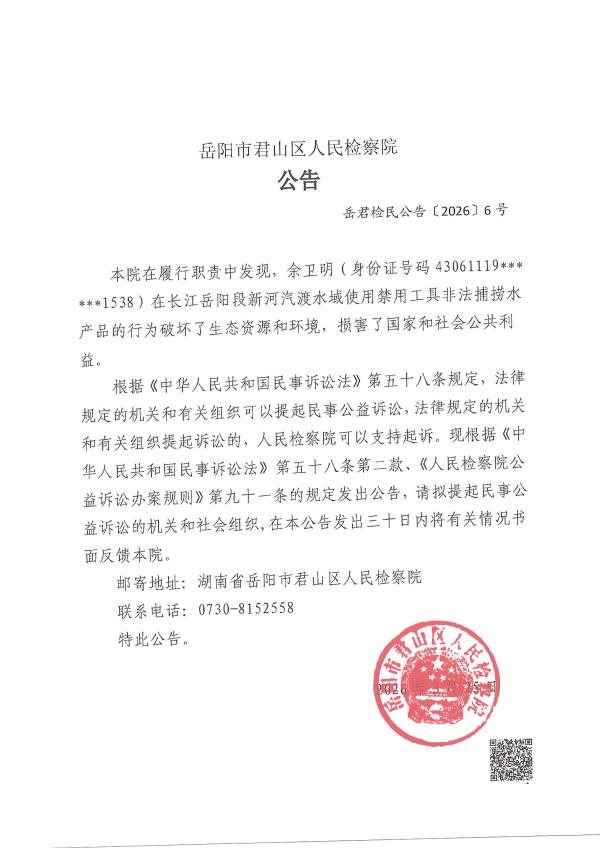 本院在履行职责中发现,余卫明(身份证号码43061119******1538)在长江岳阳段新河汽渡水域使用禁用工具非法捕捞水产品的行为破坏了生态资源和环境,损害了国家和社会公共利益。