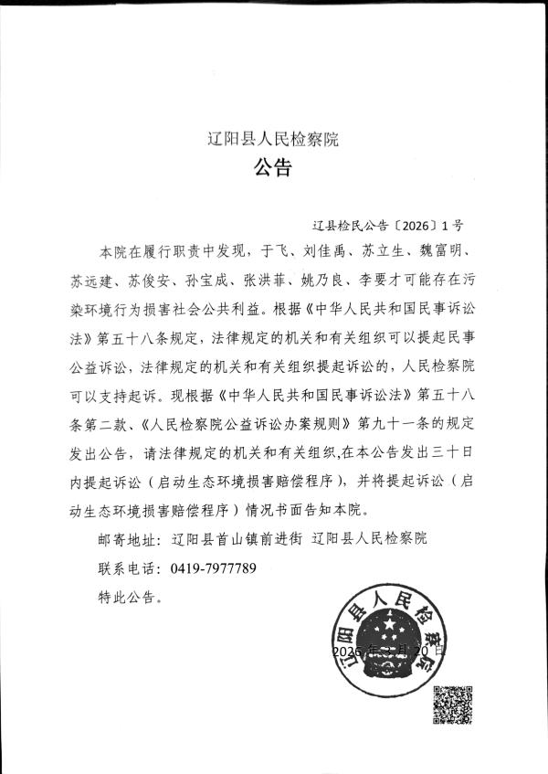 本院在履行职责中发现,于飞、刘佳禹、苏立生、魏富明、苏远建、苏俊安、孙宝成、张洪菲、姚乃良、李要才可能存在污染环境行为损害社会公共利益。根据《中华人民共和国民事诉讼法》第五十八条规定,法律规定的机关和有关组织可以提起民事公益诉讼,法律规定的机关和有关组织提起诉讼的,人民检察院可以支持起诉。现根据《中华人民共和国民事诉讼法》第五十八条第二款、《人民检察院公益诉讼办案规则》第九十一条的规定发出公告,请法律规定的机关和有关组织,在本公告发出三十日内提起诉讼(启动生态环境损害赔偿程序),并将提起诉讼(启动生态环境损害赔偿程序)情况书面告知本院。