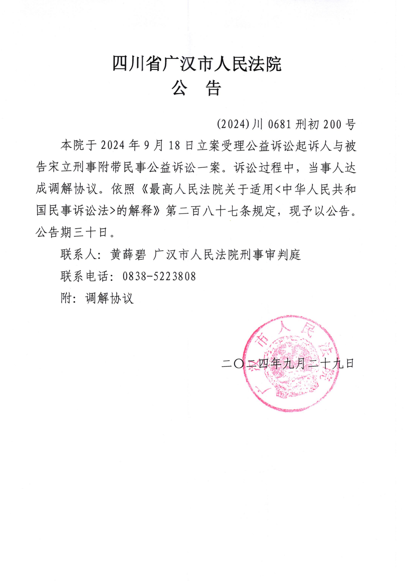 本院于2024年9月18日立案受理公益诉讼起诉人与被告宋立刑事附带民事公益诉讼一案。诉讼过程中,当事人达成调解协议。依照《最高人民法院关于适用<中华人民共和国民事诉讼法>的解释》第二百八十七条规定,现予以公告。公告期三十日。