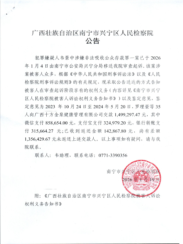犯罪嫌疑人韦景中涉嫌非法吸收公众存款罪一案已于2026年1月4日由南宁市公安局兴宁分局移送我院审查起诉。该案涉案被害人众多,根据《中华人民共和国刑事诉讼法》以及《人民检察院刑事诉讼规则》的有关规定,现采取公告送达的方式告知被害人在审查起诉阶段享有的权利义务(内容详见《南宁市兴宁区人民检察院被害人诉讼权利义务告知书》)以及鉴定意见,鉴定意见为2023 年10月24日至2024年5月20日,罗理豪等35人向广西十方金泉健康管理有限公司交款1,499,297.47元,其中微信支付858,654.00元,支付宝支付324,979.20元,银行转账支付315,664.27 元;已收到返还金额142,867.80元,尚有差额1,356,429.67元未返还上述交款人。以上事项如有疑问,请与我院联系。