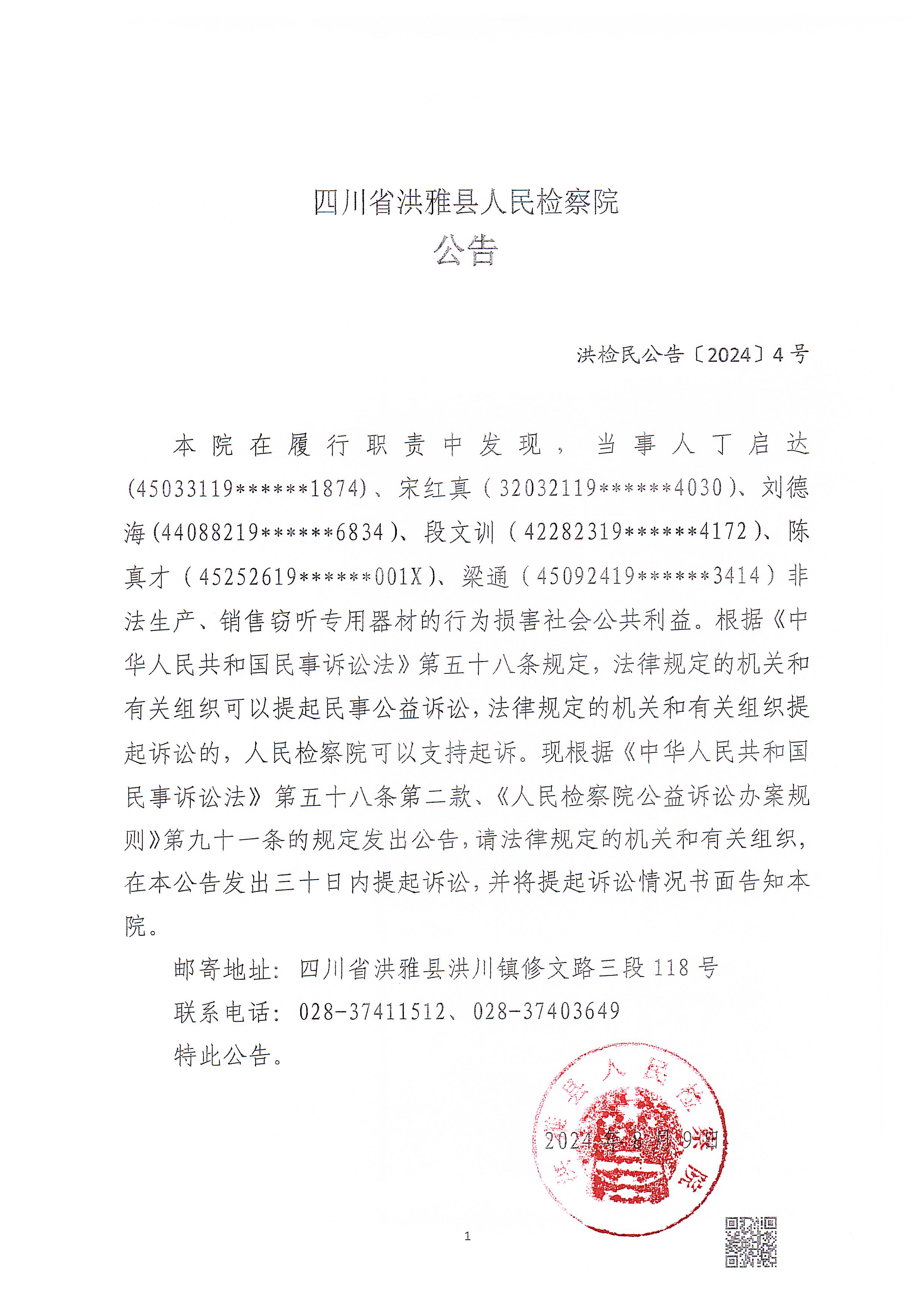 本院在履行职责中发现,当事人丁启达(45033119******1874)、宋红真(32032119******4030)、刘德海(44088219******6834)、段文训(42282319******4172)、陈真才(45252619******001X)、梁通(45092419******3414)非法生产、销售窃听专用器材的行为损害社会公共利益。根据《中华人民共和国民事诉讼法》第五十八条规定,法律规定的机关和有关组织可以提起民事公益诉讼,法律规定的机关和有关组织提起诉讼的,人民检察院可以支持起诉。现根据《中华人民共和国民事诉讼法》第五十八条第二款、《人民检察院公益诉讼办案规则》第九十一条的规定发出公告,请法律规定的机关和有关组织,在本公告发出三十日内提起诉讼,并将提起诉讼情况书面告知本院。