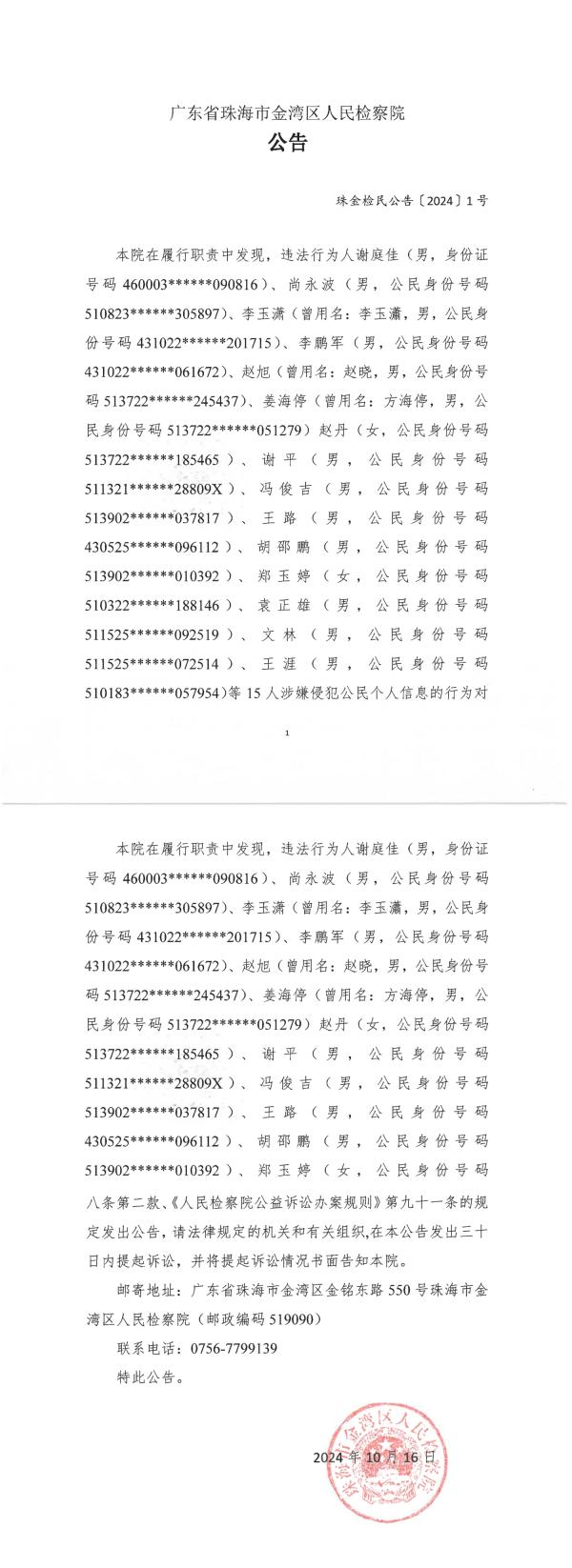 本院在履行职责中发现,违法行为人谢庭佳(男,身份证号码460003******090816)、尚永波(男,公民身份号码510823******305897)、李玉潇(曾用名:李玉瀟,男,公民身份号码431022******201715)、李鹏军(男,公民身份号码431022******061672)、赵旭(曾用名:赵晓,男,公民身份号码513722******245437)、姜海停(曾用名:方海停,男,公民身份号码513722******051279)赵丹(女,公民身份号码513722******185465)、谢平(男,公民身份号码511321******28809X)、冯俊吉(男,公民身份号码513902******037817)、王路(男,公民身份号码430525******096112)、胡邵鹏(男,公民身份号码513902******010392)、郑玉婷(女,公民身份号码510322******188146)、袁正雄(男,公民身份号码511525******092519)、文林(男,公民身份号码511525******072514)、王涯(男,公民身份号码510183******057954)等15人涉嫌侵犯公民个人信息的行为对社会公共利益造成损害。根据《中华人民共和国民事诉讼法》第五十八条规定,法律规定的机关和有关组织可以提起民事公益诉讼,法律规定的机关和有关组织提起诉讼的,人民检察院可以支持起诉。现根据《中华人民共和国民事诉讼法》第五十八条第二款、《人民检察院公益诉讼办案规则》第九十一条的规定发出公告,请法律规定的机关和有关组织,在本公告发出三十日内提起诉讼,并将提起诉讼情况书面告知本院。