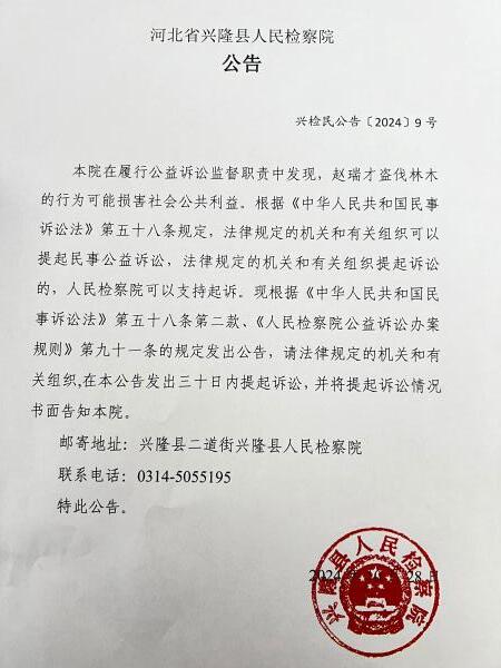 本院在履行审查起诉职责中发现,赵瑞才盗伐林木的行为可能损害社会公共利益。根据《中华人民共和国民事诉讼法》第五十八条规定,法律规定的机关和有关组织可以提起民事公益诉讼,法律规定的机关和有关组织提起诉讼的,人民检察院可以支持起诉。现根据《中华人民共和国民事诉讼法》第五十八条第二款、《人民检察院公益诉讼办案规则》第九十一条的规定发出公告,请法律规定的机关和有关组织,在本公告发出三十日内提起诉讼,并将提起诉讼情况书面告知本院。