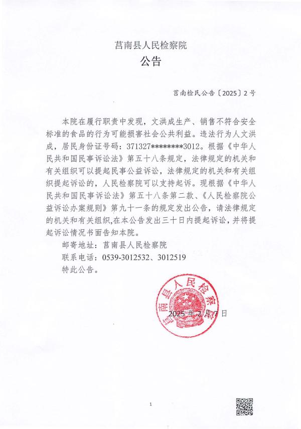 本院在履行职责中发现,文洪成生产、销售不符合安全标准的食品的行为可能损害社会公共利益。违法行为人文洪成,居民身份证号码:371327********3012。根据《中华人民共和国民事诉讼法》第五十八条规定,法律规定的机关和有关组织可以提起民事公益诉讼,法律规定的机关和有关组织提起诉讼的,人民检察院可以支持起诉。现根据《中华人民共和国民事诉讼法》第五十八条第二款、《人民检察院公益诉讼办案规则》第九十一条的规定发出公告,请法律规定的机关和有关组织,在本公告发出三十日内提起诉讼,并将提起诉讼情况书面告知本院。