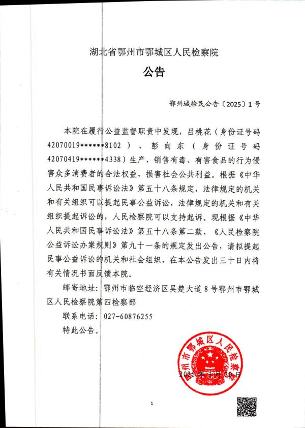 本院在履行公益监督职责中发现,吕桃花(身份证号码42070019******8102)、彭向东(身份证号码42070419******4338)生产、销售有毒、有害食品的行为侵害众多消费者的合法权益,损害社会公共利益。根据《中华人民共和国民事诉讼法》第五十八条规定,法律规定的机关和有关组织可以提起民事公益诉讼,法律规定的机关和有关组织提起诉讼的,人民检察院可以支持起诉。现根据《中华人民共和国民事诉讼法》第五十八条第二款、《人民检察院公益诉讼办案规则》第九十一条的规定发出公告,请拟提起民事公益诉讼的机关和社会组织,在本公告发出三十日内将有关情况书面反馈本院。