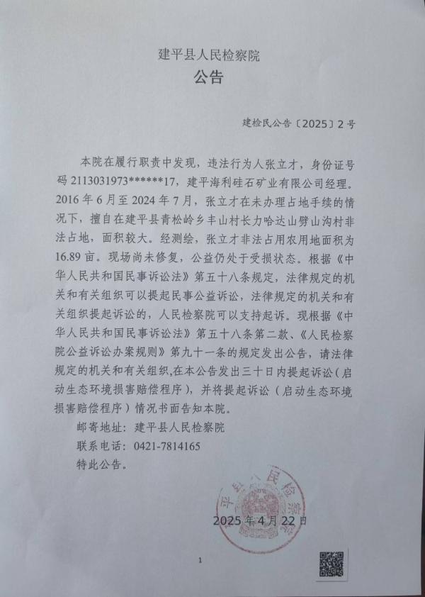 本院在履行职责中发现,违法行为人张立才,身份证号码2113031973******17,建平海利硅石矿业有限公司经理。2016年6月至2024年7月,张立才在未办理占地手续的情况下,擅自在建平县青松岭乡丰山村长力哈达山劈山沟村非法占地,面积较大。经测绘,张立才非法占用农用地面积为16.89亩。现场尚未修复,公益仍处于受损状态。根据《中华人民共和国民事诉讼法》第五十八条规定,法律规定的机关和有关组织可以提起民事公益诉讼,法律规定的机关和有关组织提起诉讼的,人民检察院可以支持起诉。现根据《中华人民共和国民事诉讼法》第五十八条第二款、《人民检察院公益诉讼办案规则》第九十一条的规定发出公告,请法律规定的机关和有关组织,在本公告发出三十日内提起诉讼(启动生态环境损害赔偿程序),并将提起诉讼(启动生态环境损害赔偿程序)情况书面告知本院。