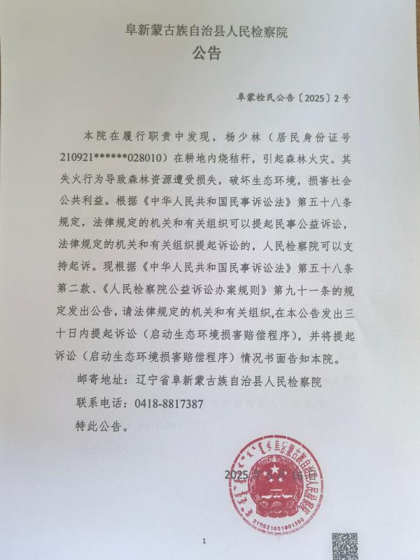 本院在履行职责中发现,杨少林(居民身份证号210921******028010)在耕地内烧秸秆,引起森林火灾。其失火行为导致森林资源遭受损失,破坏生态环境,损害社会公共利益。根据《中华人民共和国民事诉讼法》第五十八条规定,法律规定的机关和有关组织可以提起民事公益诉讼,法律规定的机关和有关组织提起诉讼的,人民检察院可以支持起诉。现根据《中华人民共和国民事诉讼法》第五十八条第二款、《人民检察院公益诉讼办案规则》第九十一条的规定发出公告,请法律规定的机关和有关组织,在本公告发出三十日内提起诉讼(启动生态环境损害赔偿程序),并将提起诉讼(启动生态环境损害赔偿程序)情况书面告知本院。