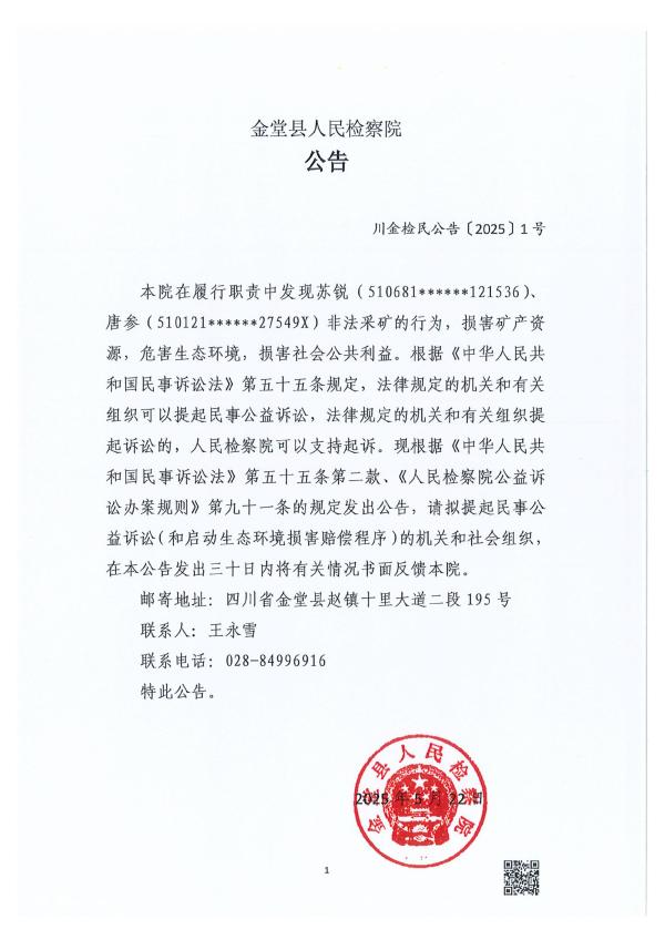 本院在履行职责中发现苏锐(510681******121536)、唐参(510121******27549X)非法采矿的行为,损害矿产资源,危害生态环境,损害社会公共利益。根据《中华人民共和国民事诉讼法》第五十五条规定,法律规定的机关和有关组织可以提起民事公益诉讼,法律规定的机关和有关组织提起诉讼的,人民检察院可以支持起诉。现根据《中华人民共和国民事诉讼法》第五十五条第二款、《人民检察院公益诉讼办案规则》第九十一条的规定发出公告,请拟提起民事公益诉讼(和启动生态环境损害赔偿程序)的机关和社会组织,在本公告发出三十日内将有关情况书面反馈本院。