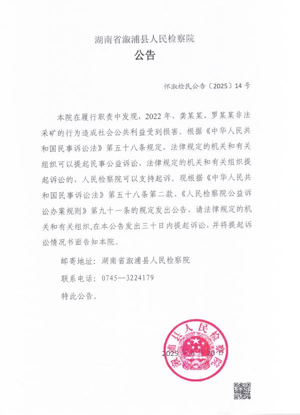 本院在履行职责中发现,2022年,龚某某、罗某某非法采矿的行为造成社会公共利益受到损害。根据《中华人民共和国民事诉讼法》第五十八条规定,法律规定的机关和有关组织可以提起民事公益诉讼,法律规定的机关和有关组织提起诉讼的,人民检察院可以支持起诉。现根据《中华人民共和国民事诉讼法》第五十八条第二款、《人民检察院公益诉讼办案规则》第九十一条的规定发出公告,请法律规定的机关和有关组织,在本公告发出三十日内提起诉讼,并将提起诉讼情况书面告知本院。