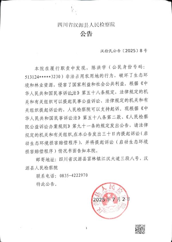 本院在履行职责中发现,陈洪学(公民身份号码:513124*****3230)非法占用农用地的行为,破坏了生态环境和林业资源,侵害了国家利益和社会公共利益。根据《中华人民共和国民事诉讼法》第五十八条规定,法律规定的机关和有关组织可以提起民事公益诉讼,法律规定的机关和有关组织提起诉讼的,人民检察院可以支持起诉。现根据《中华人民共和国民事诉讼法》第五十八条第二款、《人民检察院公益诉讼办案规则》第九十一条的规定发出公告,请法律规定的机关和有关组织,在本公告发出三十日内提起诉讼(启动生态环境损害赔偿程序),并将提起诉讼(启动生态环境损害赔偿程序)情况书面告知本院。