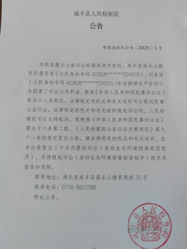 本院在履行公益诉讼检察职责中发现,咸丰县高乐山镇居民蒲宏浪(公民身份号码422826******024018)、刘香国(公民身份号码422826******020015)非法捕捞水产品的行为损害了社会公共利益。根据《中华人民共和国民事诉讼法》第五十八条规定,法律规定的机关和有关组织可以提起民事公益诉讼,法律规定的机关和有关组织提起诉讼的,人民检察院可以支持起诉。现根据《中华人民共和国民事诉讼法》第五十八条第二款、《人民检察院公益诉讼办案规则》第九十一条的规定发出公告,请法律规定的机关和有关组织,在本公告发出三十日内提起诉讼(启动生态环境损害赔偿程序),并将提起诉讼(启动生态环境损害赔偿程序)情况书面告知本院。